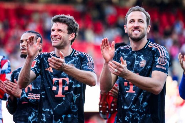 Thomas Mueller (L) y Harry Kane de Munich agradecen a los fanáticos después del partido alemán de fútbol de la Bundesliga entre el FC Heidenheim y el Bayern de Múnich en Voith-Arena. Tom Weller/DPA