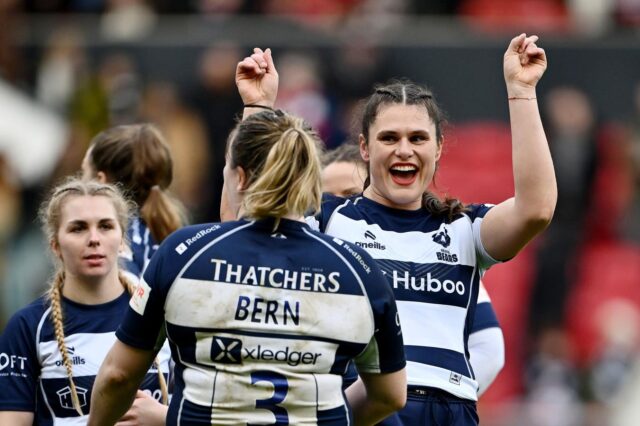 Bristol, Inglaterra – 05 de enero: Ilona Maher de Bristol Bears interactúa con su compañera de equipo Sarah Bern después de … (+)
