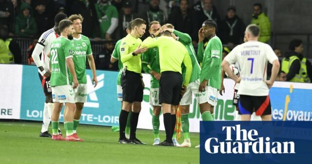 Un hombre fue arrestado después de que un árbitro asistente fue golpeado por un objeto arrojado de las gradas durante la victoria por 2-1 en casa de Saint-Étienne sobre Lyon en la Ligue 1 el domingo.