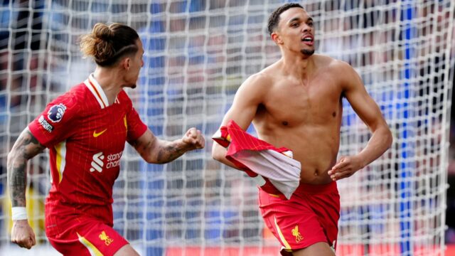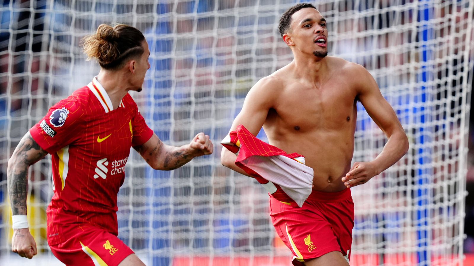 Mohamed Salah golpeó el poste y Diogo Jota sacudió el travesaño en una lucha de la boca de gol, antes de que el balón fuera despejado para que Alexander-Arnold atrasara al ganador de los 76 minutos del Liverpool y luego se quitó la camisa para celebrar frente a un endio de un extremo.