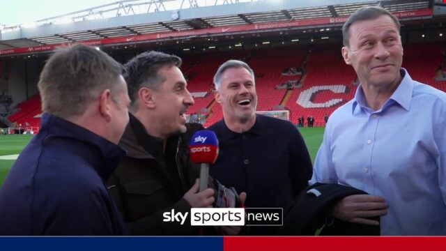 Gary Neville se hizo cargo de la entrevista de Sky Sports News antes del Derby de Merseyside para asar a Jamie Carragher sobre la situación del contrato con Mohamed Salah y Virgil Van Dijk.