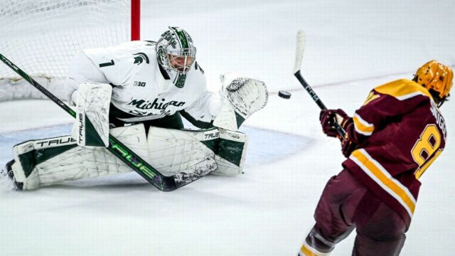 Pero para el portero de segundo año del estado de Michigan, Trey Augustine, “diviértete” va más allá de un mensaje simple y ejemplifica algo mucho más profundo: es la frase que su abuelo, Kenneth Augustine Sr., se repetiría a Trey antes de cada uno de sus juegos de hockey.