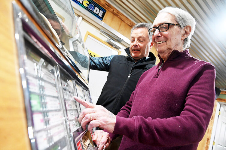 Tom DeLeo y su padre de Deleo Games, Joe DeLeo Jr., hacen una selección en un jukebox de 1951. Foto de espejo de Patrick Waksmunski