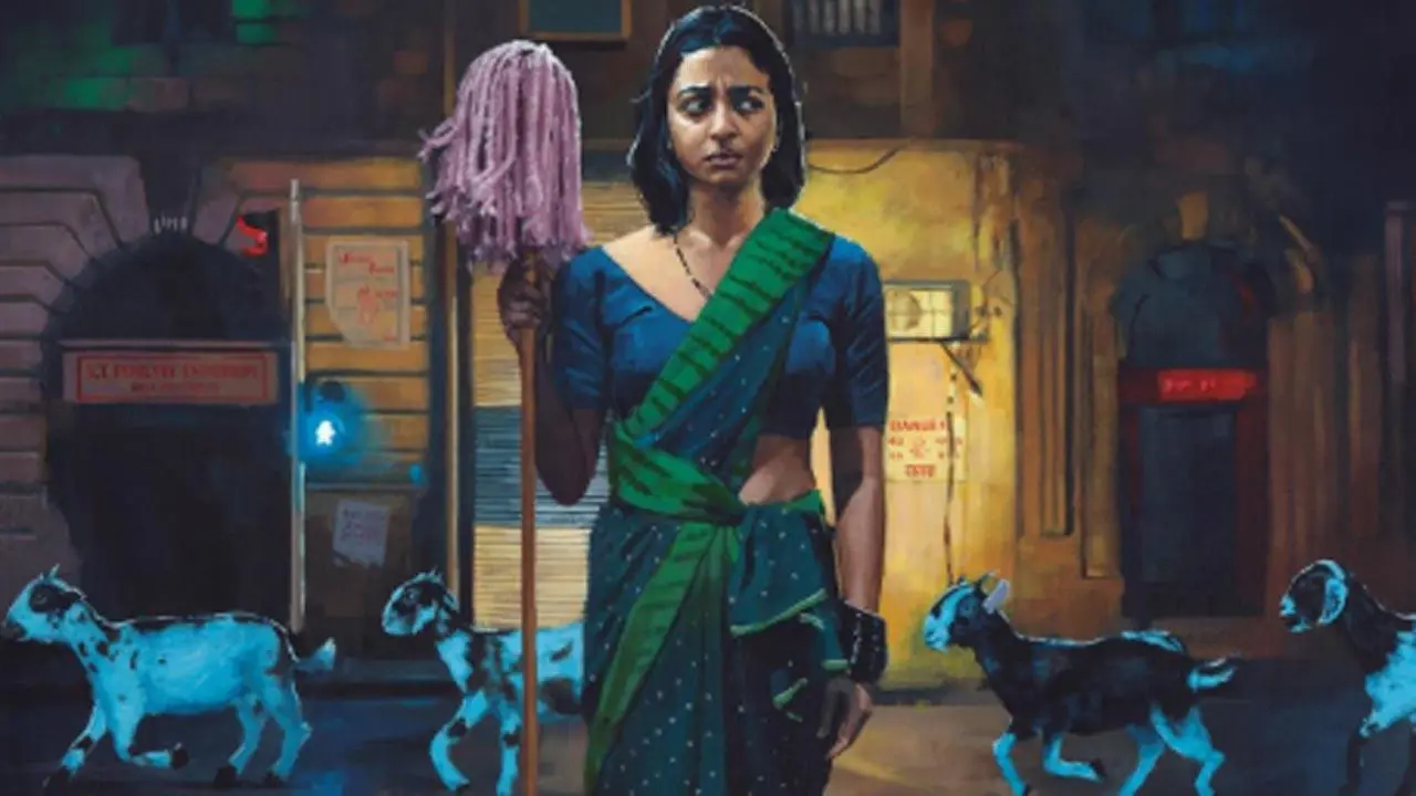 El póster muestra a Radhika de pie en una calle oscura, sosteniendo un trapeador, vestido con una sari verde y azul.
