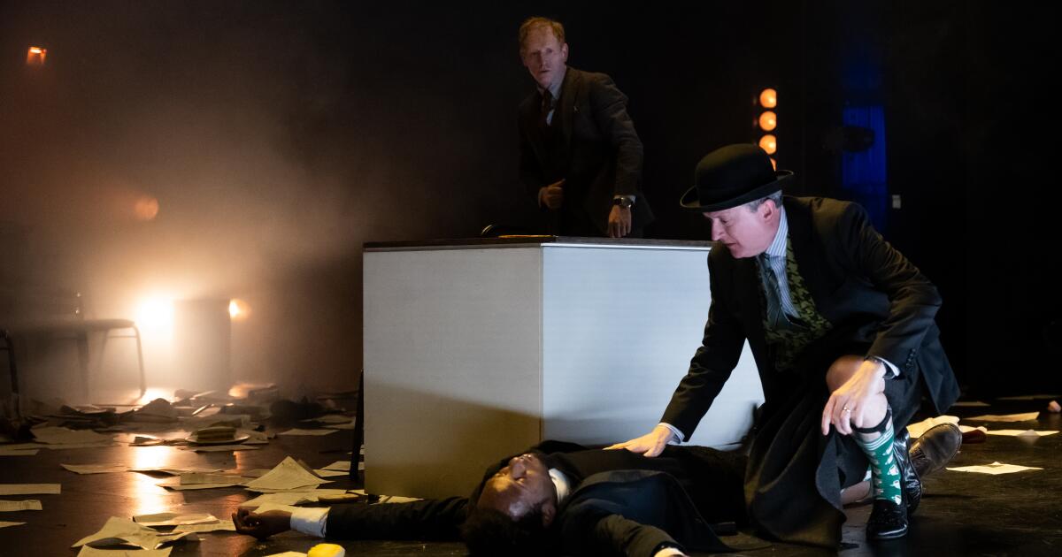 En los confines íntimos del Little Theatre de Macgowan Hall, siete actores tomaron asientos en las mesas de la conferencia alineadas para lo que parecía una discusión en panel. Un reloj institucional realizó un seguimiento de la hora ficticia del día. Scott Shepherd, un pilar de los ERS que no solo era parte del conjunto, sino que también codirigió con John Collins y se desempeñó como dramaturg, presentó los procedimientos de una manera increíblemente popular que recuerda al gerente escénico en “Nuestra ciudad” de Thornton Wilder.
