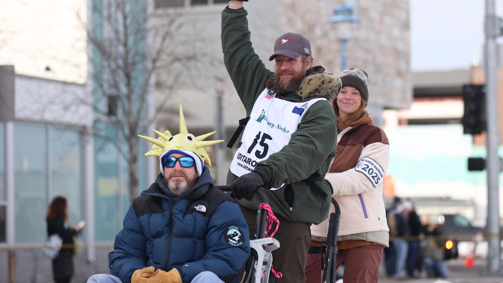 Nome, Alaska – Jessie Holmes, una ex estrella de televisión de realidad, ganó el más largo Iditarod Trail Sled Dog Race El viernes, celebrando con puñetazos a una multitud que enciende y posando para fotos con sus dos compañeros de equipo, Hércules y polar adornados con la corona floral, Hércules y Polar.