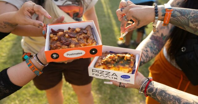 Detrás de la plaza, encontrarás Postmates ' Pizza remixcon Pizza de Prince Street 'S Signature Sicilian Style Square rebanadas cubiertas con ingredientes de restaurantes locales. Estoy haciendo campaña para que agregue la porción de Bridgetown Roticon pollo con miel y chutney de mango, al menú permanente.