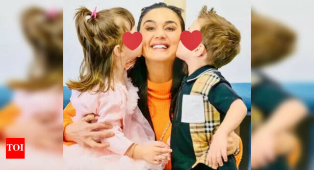Preity llevó a Instagram, donde se la ve sosteniendo a sus hijos. Tanto Gia como Jai están besando sus mejillas, y sus caras están cubiertas de emojis de corazón rojo. Mientras tanto, la actriz muestra una sonrisa de dientes.