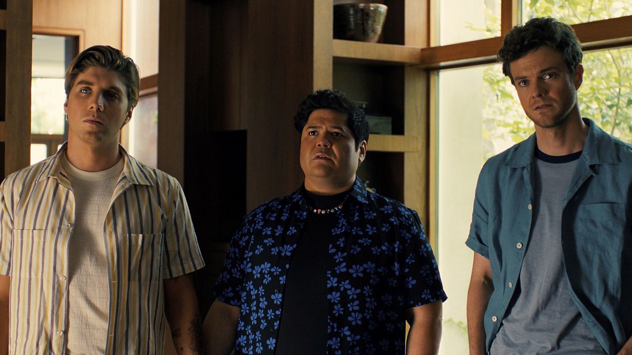 Esta imagen lanzada por Warner Bros. Pictures muestra a Lukas Gage, desde la izquierda, Harvey Guillen y Jack Quaid en una escena de “Companion”. (Warner Bros. Pictures a través de AP)