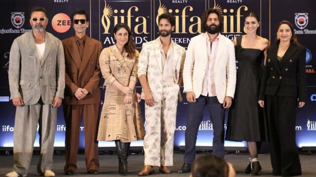 Bobby Deol, Karan Johar, Kareena Kapoor, Shahid Kapoor, Kartik Aaryan, Kriti Sanon y Madhuri dijo Reúnase para una interacción de los medios antes de los Premios Digital IIFA el sábado.