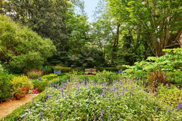 Es importante establecer una base de hoja perenne para su paisaje para evitar períodos muertos cuando sus plantas no están floreciendo. “No todo necesariamente necesita florecer”, dice Millhouse. “Piense en agregar diferentes tonos de verde y diferentes texturas”.