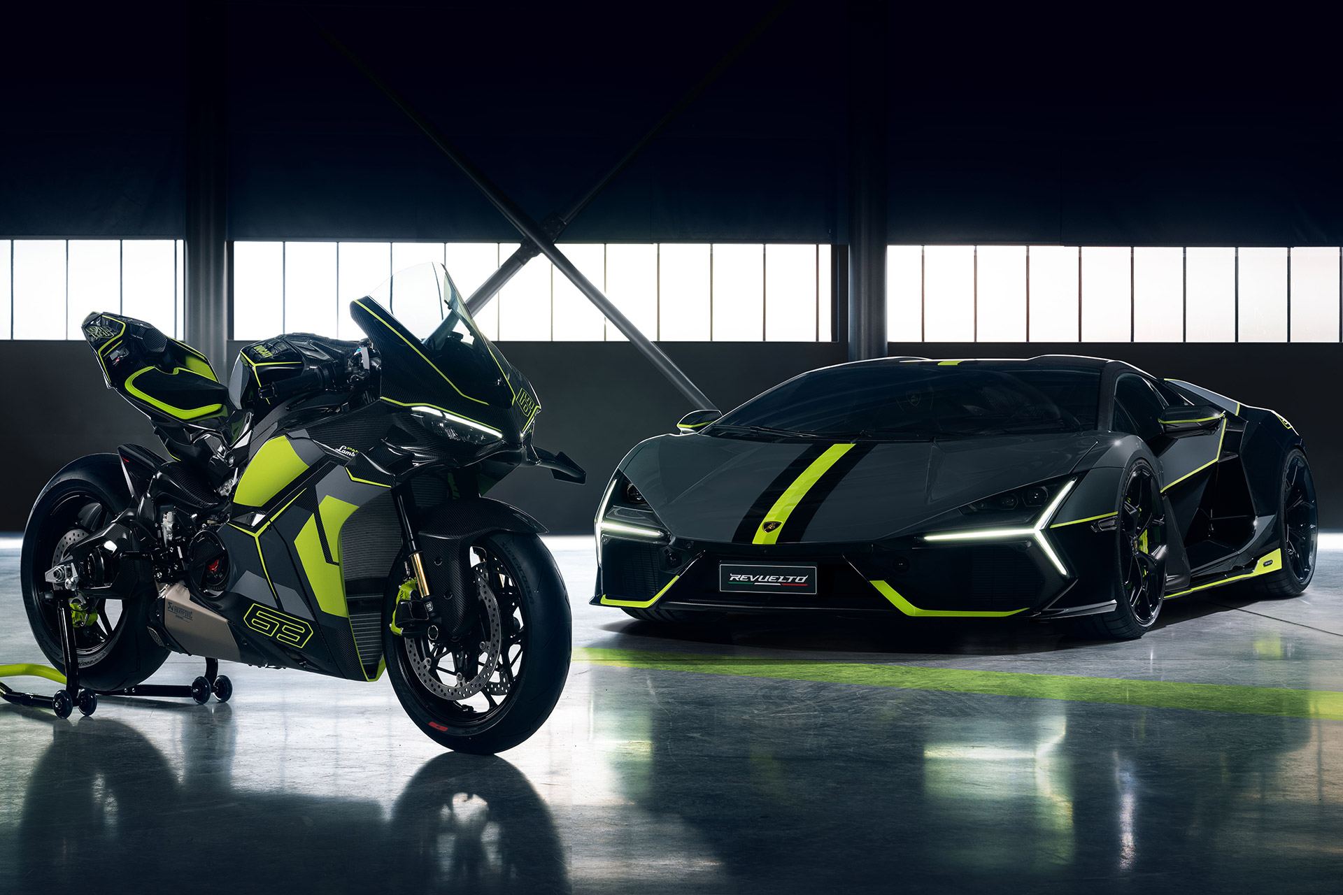 La tercera bicicleta que sale de la colaboración entre las dos empresas italianas, la Ducati Panigale V4 Lamborghini, es una máquina de rendimiento de la serie de coleccionistas. Inspirado en el Lamborghini Reviselto y basado en el V4 S, ha forjado llantas de aluminio diseñadas específicamente en el mismo estilo que las de Reviselto, y una pieza de cola revisada y alas que coinciden con las líneas de revuelto. La librea también es similar, con una base de fibra de carbono expuesta con acentos verdes brillantes. La potencia es suministrada por un motor Dessmosedici Stradale que fabrica 209 hp, con componentes de suspensión Öhlins y un silenciador de titanio Akrapovič. La versión estándar del Panigale V4 Lamborghini está limitada a 630 ejemplos y se unirá una versión de Clienti Speciale que permite a los clientes selectos trabajar con Ducati Centro Stile para combinar el esquema de color de la bicicleta con la de su Lamborghini.