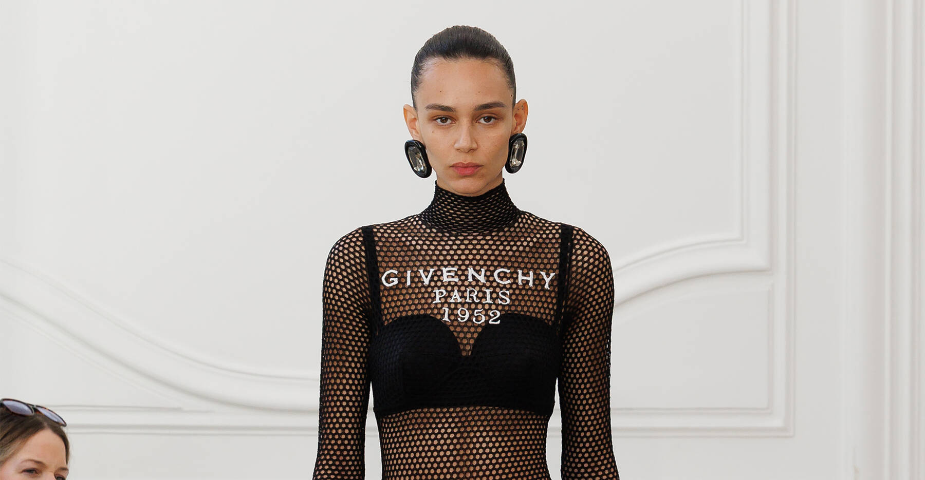 A medida que se debutan, fue un aturdidor. El trabajo de Sarah Burton en Alexander McQueen la estableció como una fuerza de diseñadora global, pero ¿podría sobresalir fuera de los límites de la casa de McQueen? Demonios, sí. Desde el primer vistazo, el dominio de Burton de Cut, su control total de la línea y la proporción fueron evidentes. La precisión de su trabajo y su destreza de diseño es impresionante. Lo despojó y lo construyó, en un movimiento de fluido, comenzando con un traje de malla impreso con la fecha del show de alta costura debut del Sr. Hubert de Givenchy en 1952 en una tipos de tipos de tipografía de un muñeco original de Stockman de la época. El aspecto era simple pero telegrafió que Burton's Givenchy sería sobre la feminidad del cuerpo.