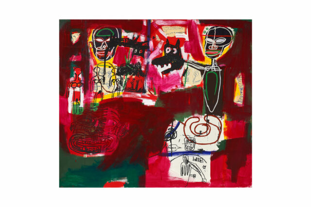 Creado en 1984, el mismo año que su primer espectáculo en el museo en solitario, Jean-Michel Basquiat's Sabado por la Noche (Saturday Night) está entre sus obras más icónicas. Al igual que con muchos de sus esfuerzos, mezcla múltiples motivos y sujetos. Contra un atrevido fondo rosa y granate, uno puede elegir figuras de Griot de África occidental, así como un perro, formas femeninas y láminas de papel garabateadas con varios símbolos y términos, incluidos “conocimiento”, “verdad” y “nacimiento”. Mediendo 6.5 'por 7.5', el trabajo será subastado por Christie's como parte de su venta nocturna del siglo XX/21 en Hong Kong el 28 de marzo.