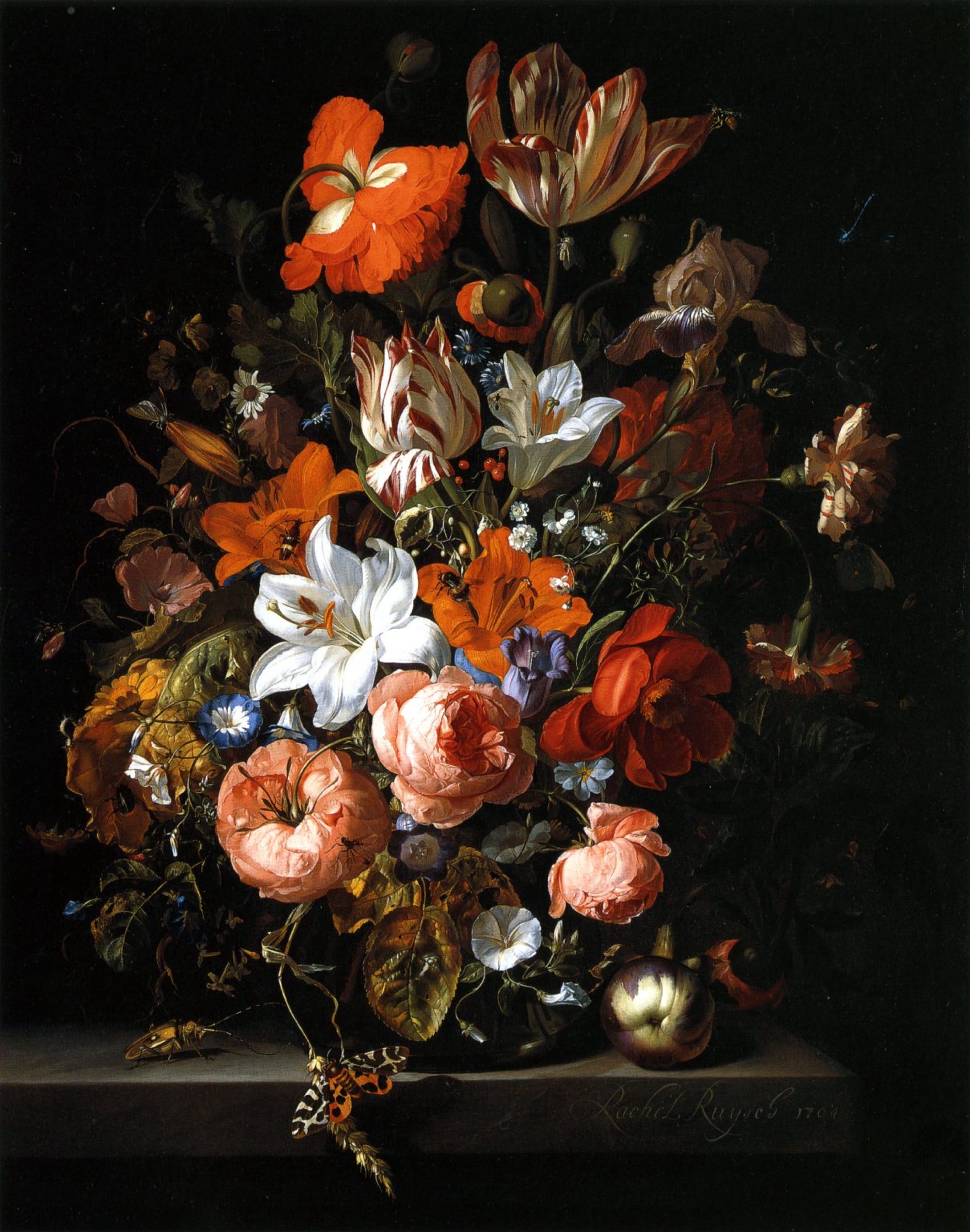 El éxito de Ruysch durante su vida se atribuye tanto a su inconfundible talento como a la afición holandesa del siglo XVII por las flores y la jardinería. Las pinturas de la vida muerta de arreglos florales y mesas colmadas con comida resaltaron la belleza de la naturaleza y los regalos de la abundancia. El género de Vanitas también surgió del estilo, interpretando Memento MoriLatín para “Recuerda que debes morir”, en señales visuales sutiles y bien versadas.