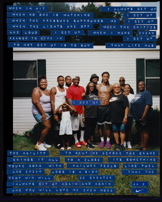 Las cartas gráficas del estudio se sientan sobre imágenes crudas y gloriosamente granuladas del Archivo de Players de la NBA de fotos familiares: momentos que juegan con familiares y amigos en su casa de la infancia, contrastadas con imágenes compuestas de él a mitad de volcado. Estos elementos se unieron para crear collages que tienen el aire de las viejas tiras de películas juntas: sus imperfecciones y fugas de luz se fusionan para crear composiciones dinámicas. El lema 'Get Up', es una referencia a las “habilidades locas de salto de JA como uno de los mejores dunkers de la liga”, pero también un mensaje sobre su pasado como su capacidad para “superar la adversidad”, dice Carl-Emil.