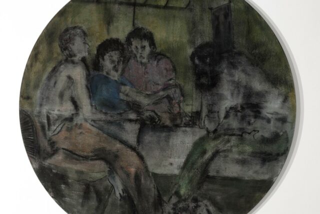 En algunos de los lienzos en forma de ovalado, las pinturas juegan con ideas de repetición y tiempo. La misma escena se convirtió en diferentes horas de luz del día o en diferentes estados se convierte en un estudio sobre cómo la percepción altera el significado: un desplegador no lineal donde la memoria, la luz y la emoción se vuelven a sí mismos. “Hice una serie de la misma escena en diferentes momentos”, reflexiona Leotaud, “ver cómo la luz o la atmósfera podrían cambiar toda la sensación”. Incluso el proceso material refleja esta idea. Trabajando con un moquillo basado en pegamento, Leotaud crea texturas que parecen contener el rastro de cada gesto. “Aprendí que frotar la superficie lo desarrolla más que cepillarse … crea estas áreas que se sienten casi como piedra”. Al igual que la memoria, estas superficies están en capas, se frotan y se usan. Nunca se fijan.