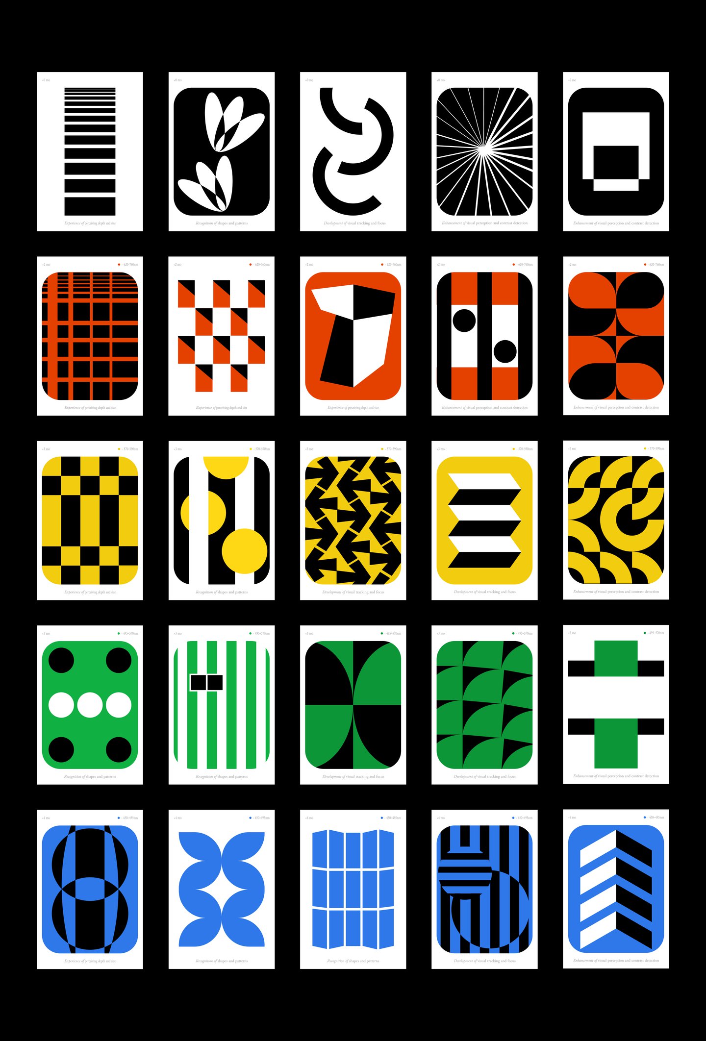 Los patrones implicaron una investigación muy extensa. Elena quería que se sintieran juguetones, pero, lo que es más importante, para cumplir un propósito. “Estudié las habilidades visuales clave que comienzan a surgir en los primeros seis meses de vida y las usé como la base del sistema de diseño”, explica Elena. “Quería entender no solo lo que los bebés pueden ver, sino cómo evoluciona su visión, momento a momento”. Al regresar a los principios básicos de la percepción visual e ilusiones ópticas, a saber, cómo el ojo se guía y enfoca por la forma, el ritmo, el contraste y la tensión espacial, Elena determinó las cuatro áreas clave de desarrollo visual temprano: experiencia de percepción de profundidad y tamaño, reconocimiento de formas y patrones, mejora de la percepción visual y la detección de contraste y el desarrollo de el desarrollo de la rastreo visual y el enfoque y el enfoque y el enfoque y el enfoque. “Estos cuatro pilares de la serie no eran temas abstractos, surgieron de esa investigación como etapas esenciales de cómo el cerebro visual comienza a formarse”, dice Elena. “Son composiciones visuales, que hablan de los sentidos mucho antes del lenguaje, el significado o la memoria entran en juego”.
