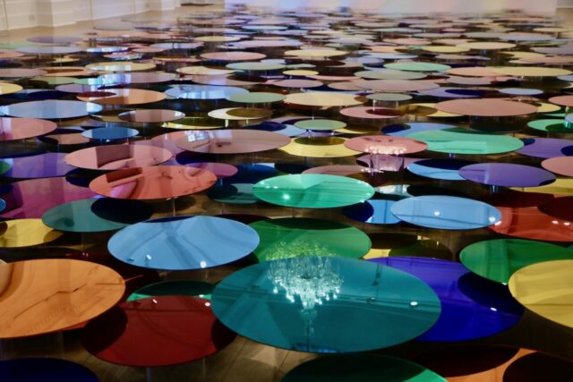 Continuando su interés en los efectos de la luz, los reflexiones y las relaciones cromáticas (anteriormente), el artista creó “nuestra reflexión de color”, la pieza central de FELIZ, Para resaltar el poder emocional, psicológico y físico de la vitalidad y el tono.