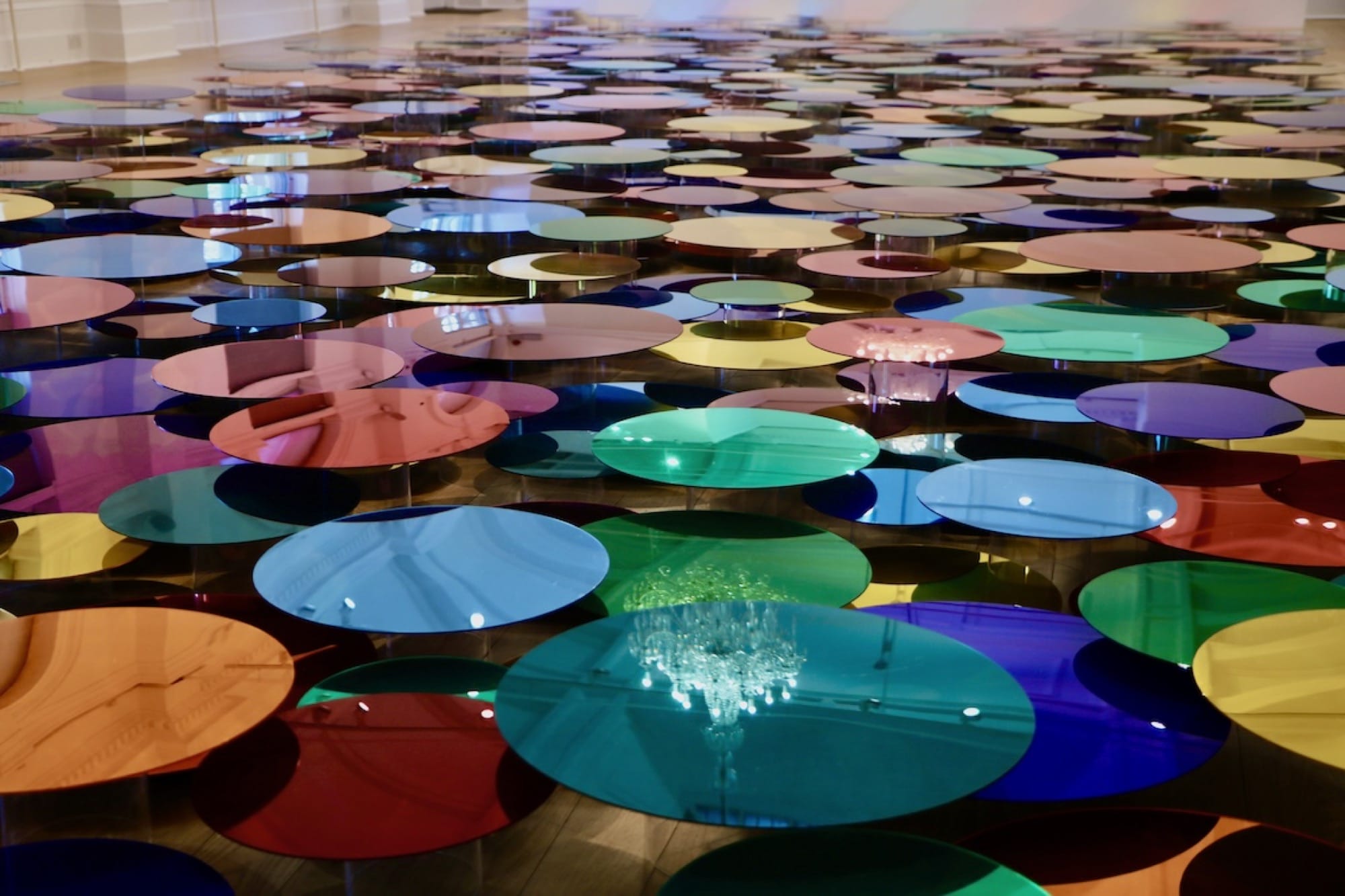 Compuesto por 765 discos multicolores en capas en bajo alivio en todo el piso, la pieza transforma el entorno en una experiencia luminosa que interactúa con la luz natural y artificial y evoluciona durante todo el día.