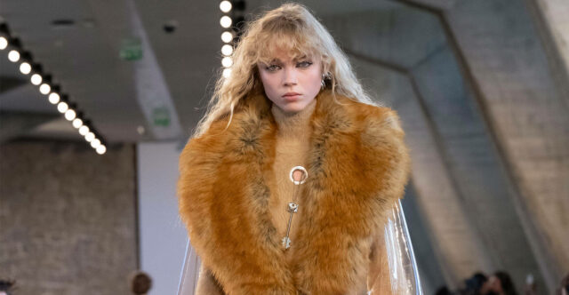 Faux Fur tomó el lugar del título en la pasarela. Los abrigos de lujo y envolventes cubrieron el cuerpo, solo para estallar en colas omnáuticas y tupidas que aparecían con cada paso. La sastrería tradicional fue subvertida, con faldas escocidas forradas en mechones salvajes y superficies brillantes que se pelaron para revelar algo crudo debajo. Se trataba de tensión: la tensión entre lo pulido y lo rebelde, lo afilado y lo suave.