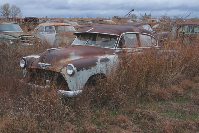 Cuando se acercaban al sitio de la masacre de la rodilla herida, apareció un extraño oasis de repente: un campo de agricultor lleno de los restos maltratados y abandonados de los autos y camiones estadounidenses clásicos de los años 50 y 60. Hecho en Detroit cuando la ciudad simbolizaba una nueva clase trabajadora que podía permitirse vivir, trabajar, poseer una casa y alimentar a una familia en un salario de fábrica. En ese momento, la fabricación estadounidense no ahorró gastos, como lo demuestra la conveniencia de las piezas eliminadas y vendidas en este depósito cuidadosamente curado. Lyon saltó del auto, obtuvo permiso, hizo algunas fotografías y siguió adelante como era su costumbre. No lo pensé mucho hasta un día 20 años después, cuando pasaron por un pequeño campo de autos viejos en la Ruta 66.