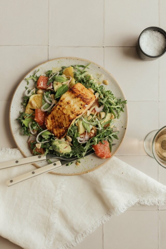 Ensalada de salmón de cítricos con aguacate, camisa amarilla
