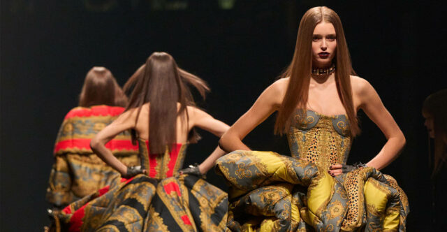 Se dirigió al archivo de impresiones barrocas de Versace Homewear, una de las primeras líneas de artículos para el hogar creados por una marca de moda, para inspirarse. Junto a eso miró a su hermano, los diseños de disfraces de Gianni Versace para el ballet. Las faldas de crinolina que desafían la gravedad se forraban en impresiones de archivo. Esas mismas impresiones aparecieron en lujosos abrigos nórdicos, mientras que las colchas de la colección Versace Home se introdujeron en grandes vestidos, lo que llevó un significado completamente nuevo para consolarse.