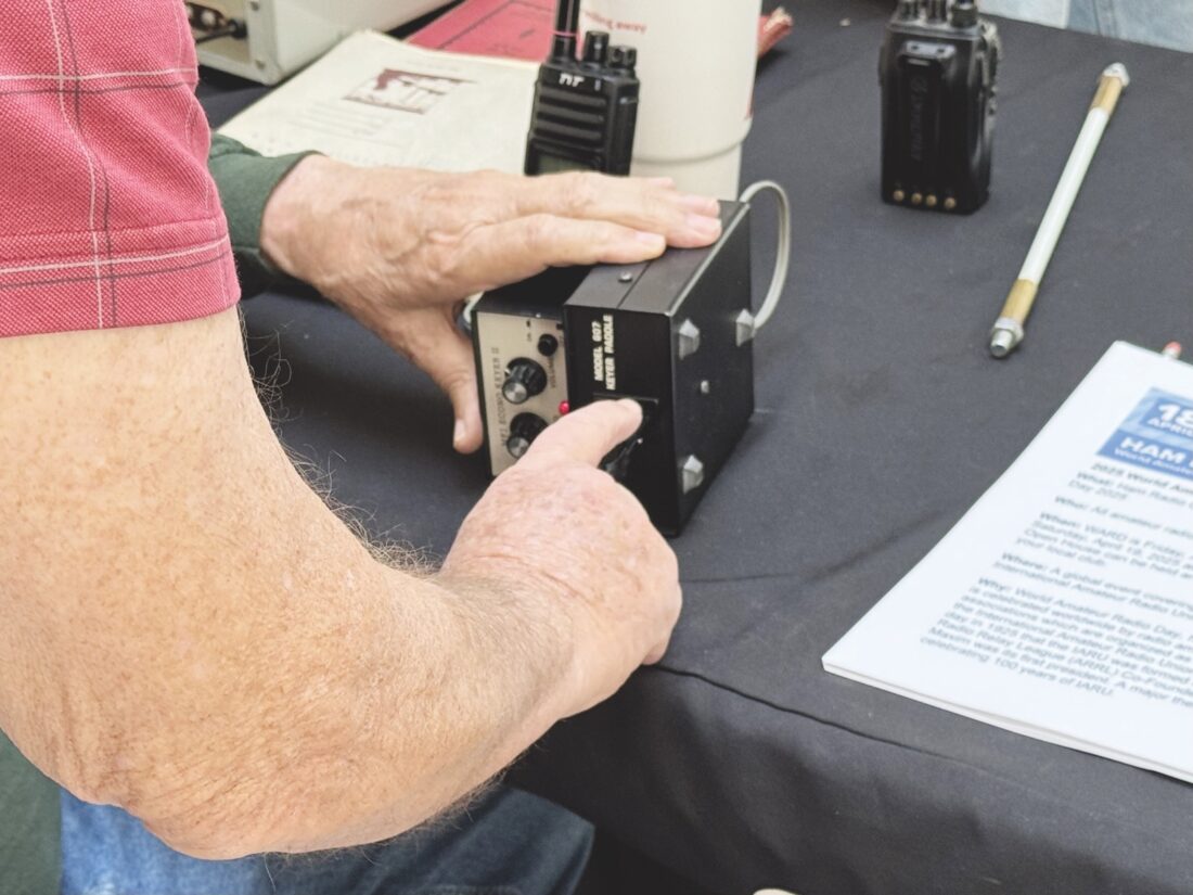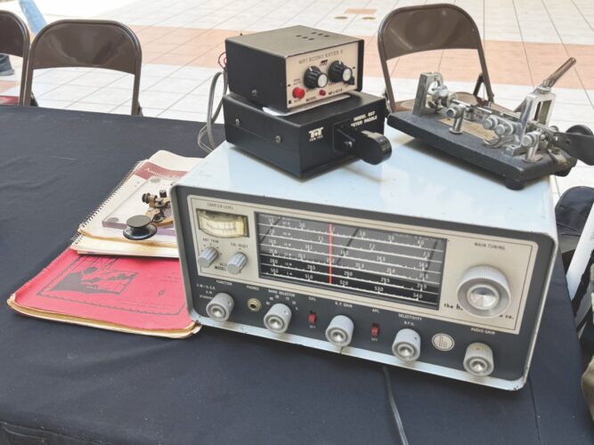 Los miembros de la Radio Amateur de Parkersburg se mostraron a las personas interesadas en el centro comercial cómo usar una clave de telégrafo para el código Morse y compararon radios de principios de la década de 1960 hasta ahora.
