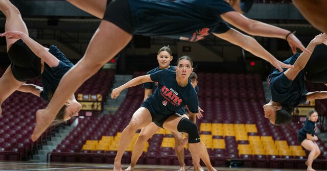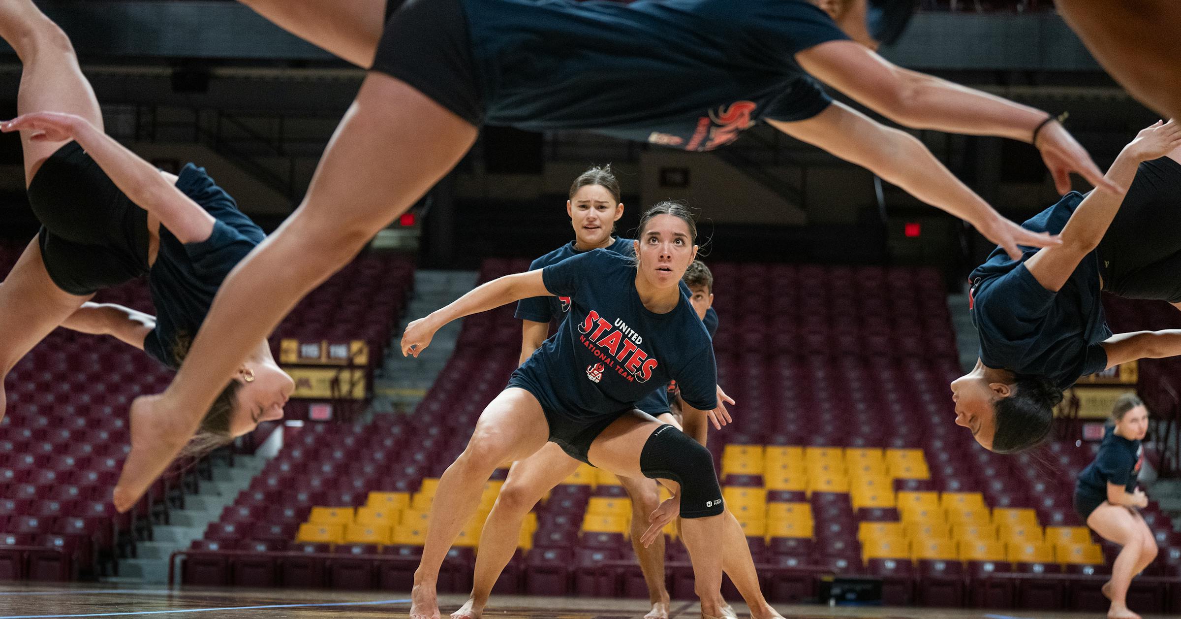 Ava Wagner, Front y Chole Shaw son enmarcadas por sus compañeros de equipo del equipo de baile de la Universidad de Minnesota durante la práctica en el Williams Arena en Minneapolis a principios de este mes. El equipo compitió en las semifinales de POM y Jazz el jueves en el Campeonato Mundial de la Unión Internacional de Cheer en Orlando, Florida (Jerry Holt/The Minnesota Star Tribune)