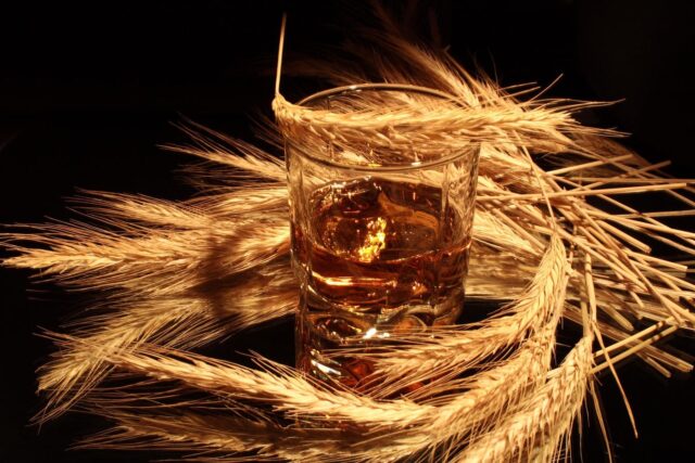 Un vaso de whisky de centeno y orejas de grano de centeno