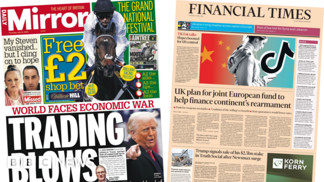 Pocos de los documentos de esta mañana evitan mencionar la guerra comercial mundial que Donald Trump comenzó el miércoles, y muchos informaron una versión del banner utilizada en el frente del Daily Mirror: “World enfrenta la guerra económica”. Según el titular “Comercio”, el papel informa que Universal 10% tarifas se colocarán en todas las importaciones en los EE. UU. Que se anunciaron anoche, que entrará en vigencia el 5 de abril.
