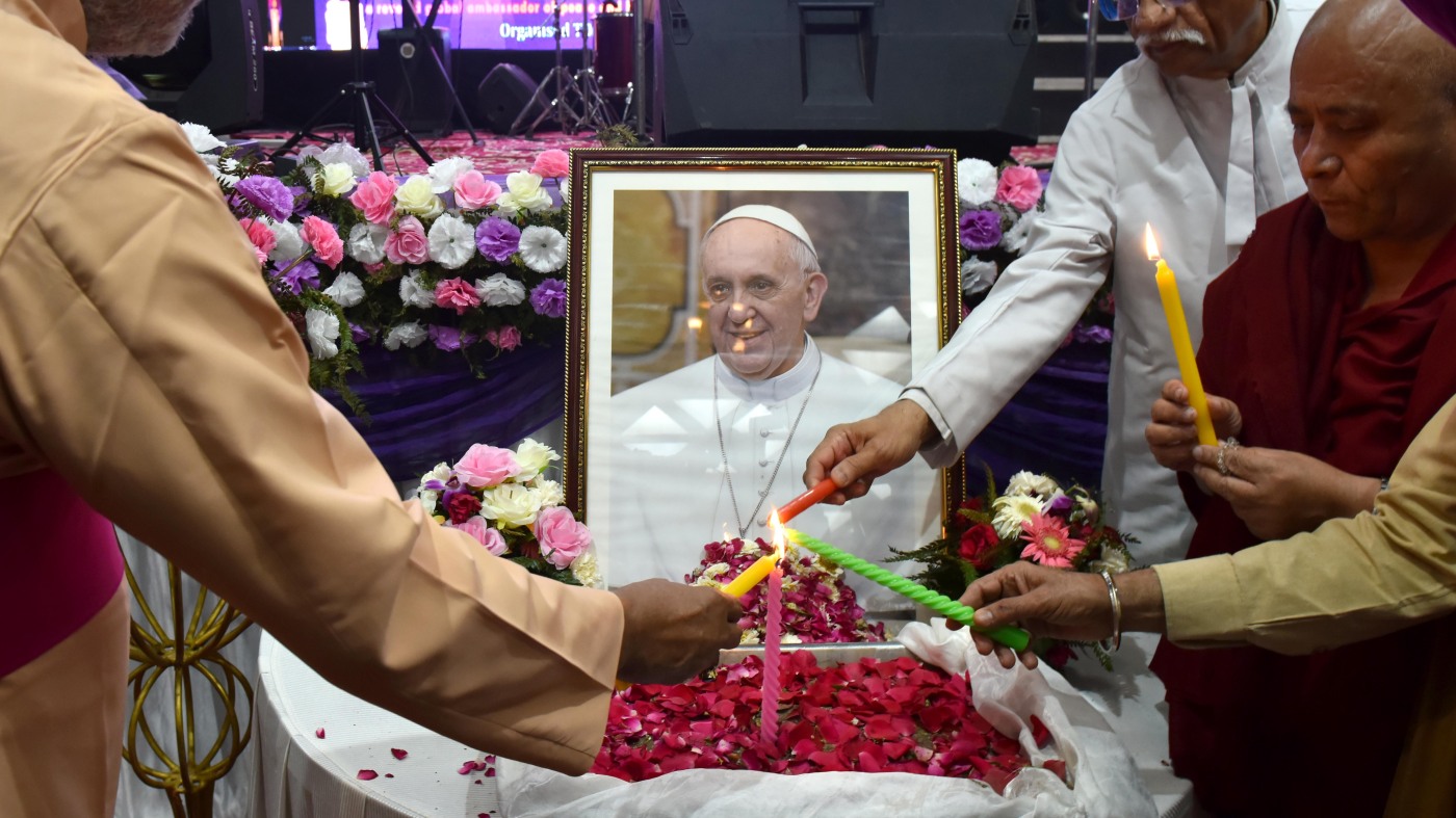 La gente asiste a una reunión conmemorativa interreligiosa para llorar la muerte del Papa Francisco en Nueva Delhi, India, el lunes.
