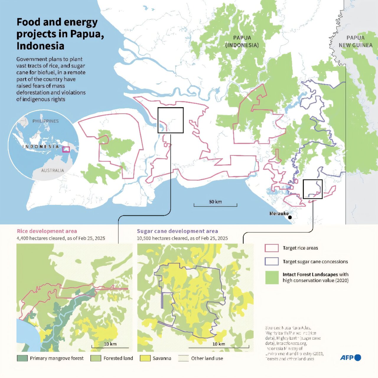 Infográfica que muestra imágenes satelitales de la autorización forestal para el cultivo de arroz en Papua, Indonesia.