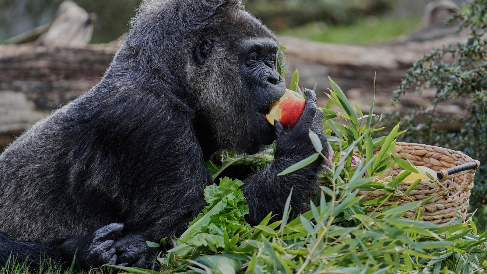 Gorilla Gorilla Fatou, la más antigua del zoológico de Berlín y también se cree que es la gorila más antigua del mundo, disfruta de su canasta de cumpleaños con una “sorpresa de comida de gorila”, mientras el zoológico celebra su 68 cumpleaños en Berlín, Alemania, viernes 11 de abril de 2025. (AP Photo/Ebrahim Noroozi)