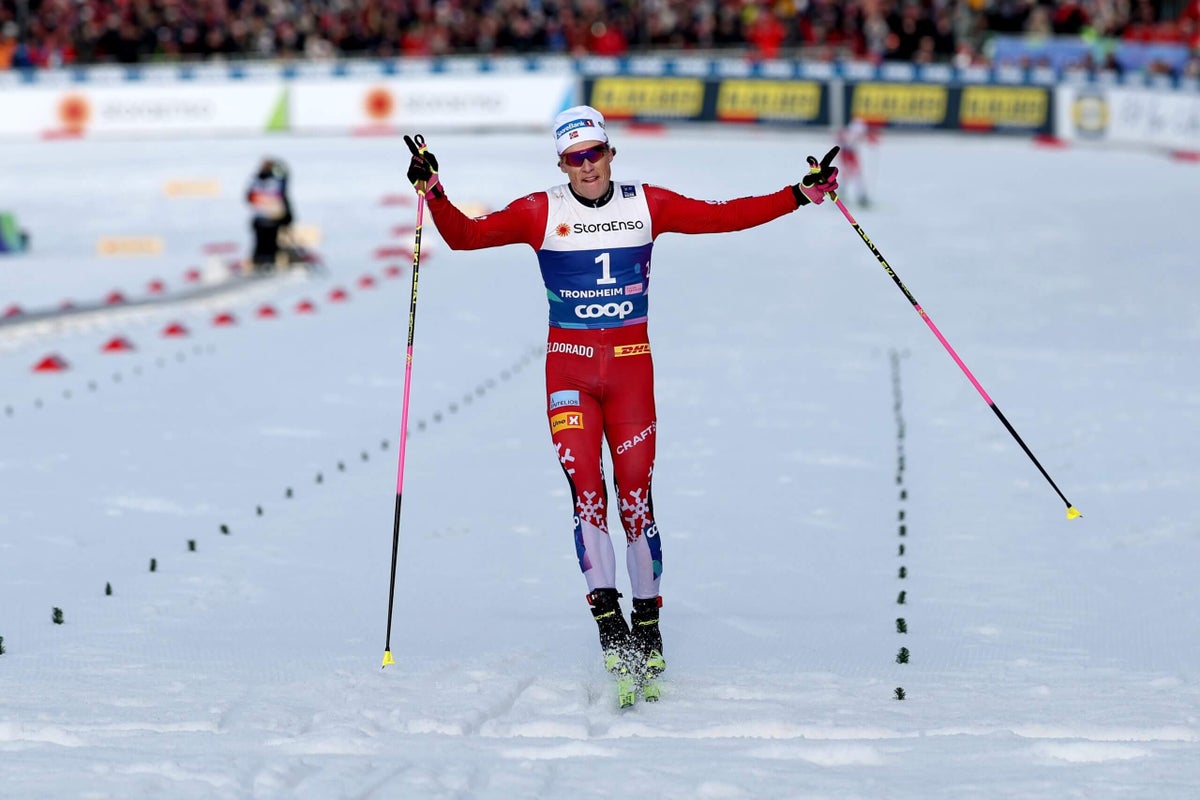 Klæbo corrió hasta el final, y justo antes de cruzar la línea, se asomó a los otros contendientes que se habían desvanecido por los finales kilómetros del comienzo de misa masculino de 50 km del sábado en el Fis Nordic World Ski Championships. Levantó las manos a una porción de los aproximadamente 100,000 fanáticos caseros que empacaron la ladera de la montaña en Trondheim, celebrando una victoria que completó un barrido de medalla sin precedentes y estampó su lugar en la tradición a través del país.