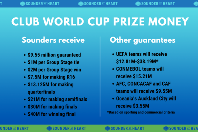 El grupo de premios totales se ha establecido en $ 1 mil millones, con diferentes cantidades garantizadas en clubes en función de los cuales son la federación de los que son. Los Sounders, como uno de los cinco participantes de CONCACAF, se les garantizará $ 9.55 millones solo para tocar en la fase de grupos. Podrán reclamar un sorteo adicional de $ 1 millón por cada sorteo de la fase de grupos y $ 2 millones para cada victoria en la fase de grupos. Si fueran a avanzar fuera de la etapa grupal, eso garantizaría $ 7.5 millones adicionales. En el escenario muy poco probable de que ganara todo el torneo, reclamarían más de $ 100 millones.