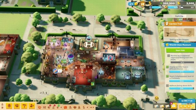 A diferencia de los hospitales y escuelas, donde los pacientes y los estudiantes acuden a usted, en un museo, debe enviar a su equipo de exploradores expertos al mundo para recuperar las exhibiciones que atraerán a los clientes que pagan. Es una maravillosa sensación de descubrimiento a medida que descubres lentamente los diversos mapas del juego y construyes tu colección de exhibiciones, colocándolos en tu museo lo más atractivo posible para atraer a los invitados.