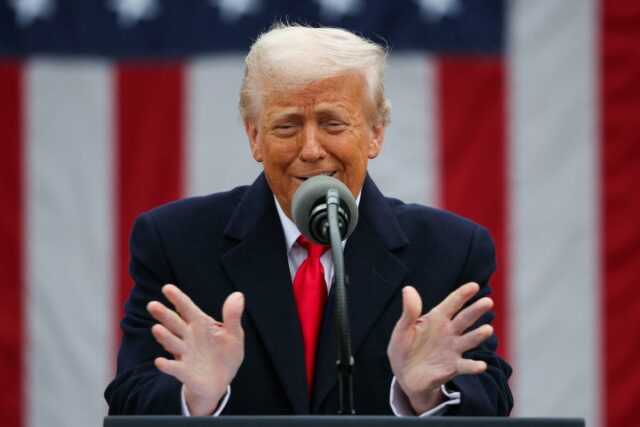 El presidente pronunció su discurso con miembros de su gabinete, miembros del Congreso, otras autoridades y trabajadores industriales como invitados. Detrás de él tenía grandes banderas de los Estados Unidos. Trump proclamó el “Día de la Independencia Económica de los Estados Unidos” mientras arrojaba figuras falsas para justificar sus medidas.